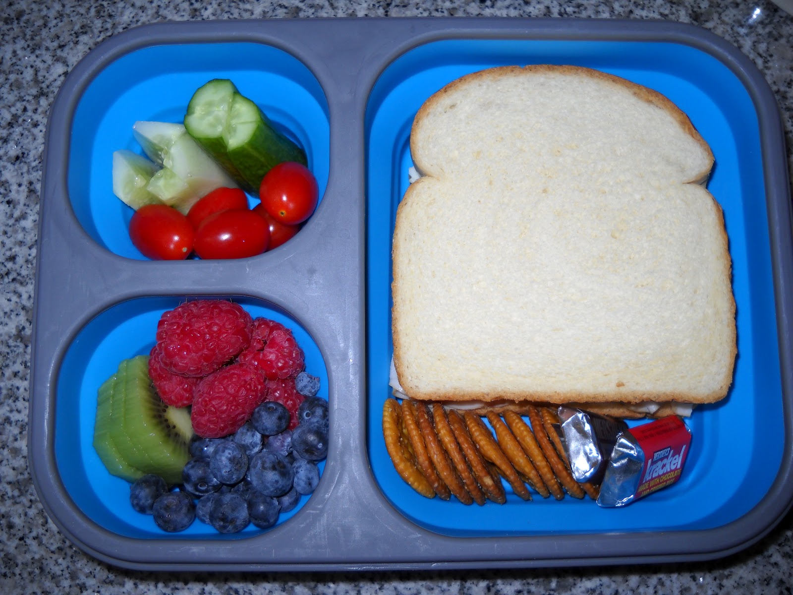 My husband had cucumber and tomatoes in the first section and kiwi, raspberries, and blueberries in the second section. The large section held a turkey sandwich, pretzel crackers, and a couple of mini chocolate bars.