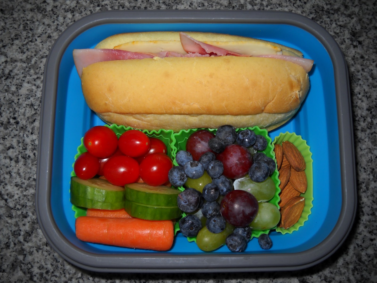 This was a lunch for me. I had ham and cheese on a deli roll along with tomatoes, cucumber slices, carrots, grapes, blueberries, and almonds.