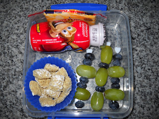 This was a packed breakfast for my daughter. She had a yogurt drink, a slice of cheese, some Frosted Mini Wheats, and grapes and blueberries on picks. This was packed in a new Sistema box. It looks square, but it slightly larger in one direction. Because of that, I think it might be tricky for my daughter to get the lid back on herself, so I don’t think I will be using it for her school lunches.