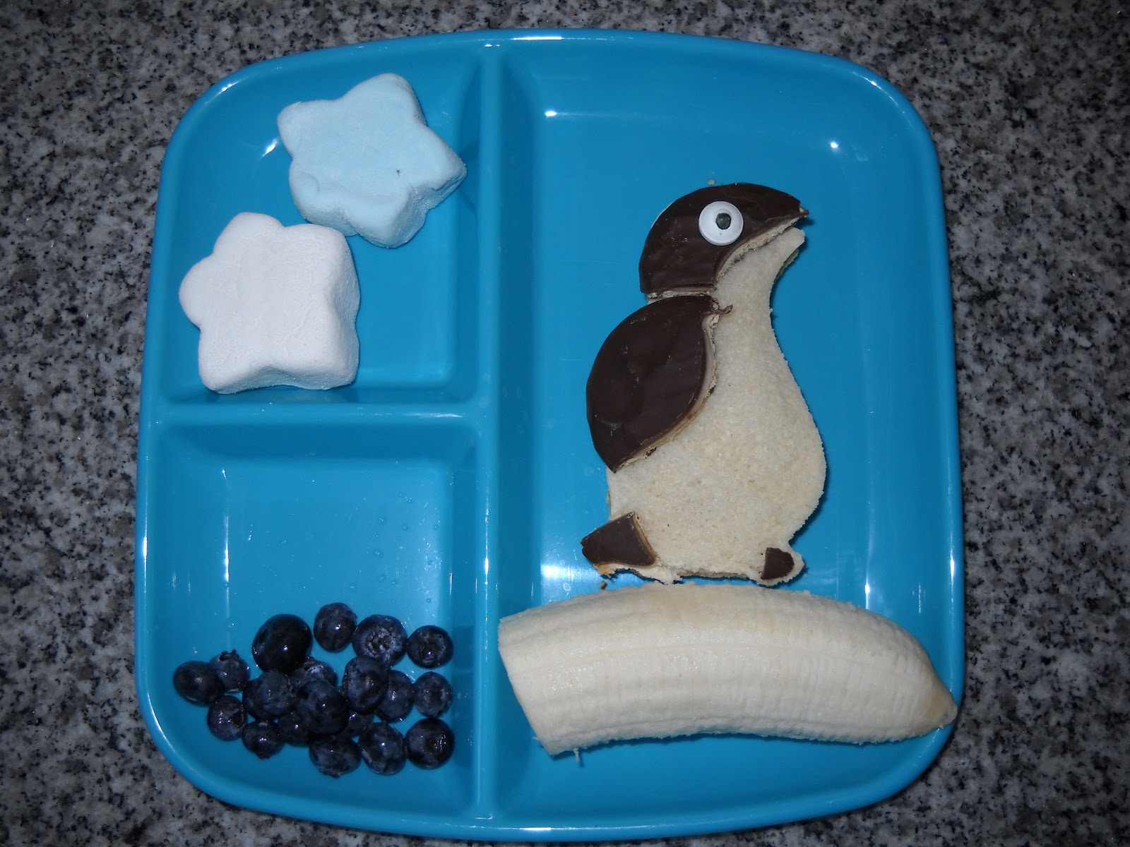 This was a really quick, but cute, snack made to occupy my daughter while I put groceries away. She had two marshmallow stars, a few blueberry “snowballs”, and a small penguin peanut butter sandwich standing on a banana “iceberg”. The penguin was decorated with a fudge covered Oreo slice that I quickly cut with a cup.