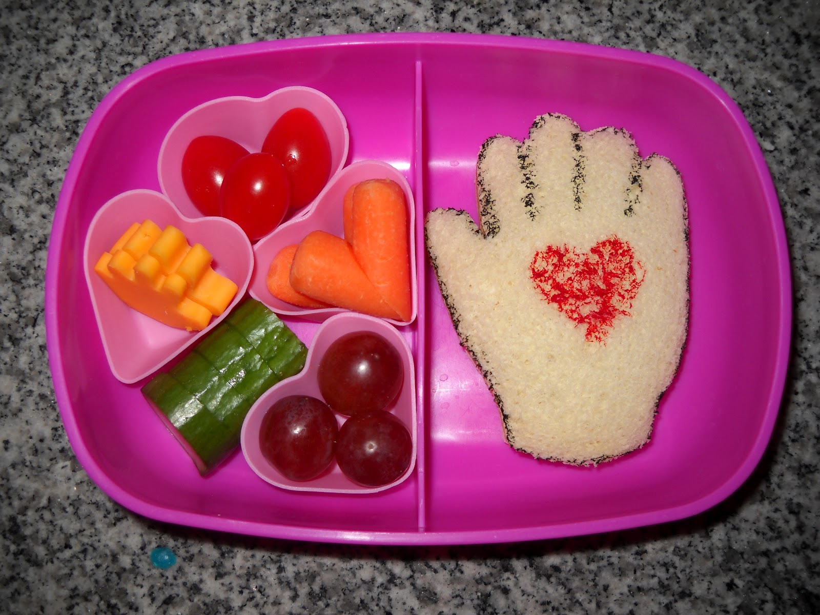 On the first day of school, my daughter’s teacher read The Kissing Hand and the class colored a picture of the raccoon from the story. My daughter loved the book and told us all about it, reminding us several times that we should kiss her hand each night just like the raccoon’s mother did. I was pleased to her her recount the story in such detail because it was usually very difficult to get her to reveal anything about her day last year at preschool. Since, she loved the book so much and because she seemed to have such a nice memory of her teacher reading it to the class, I decided that it would be a great theme for her lunch on the second day of school. Packed in our pink Sassy box, she had a hand-shaped sandwich decorated with food safe markers with a heart the way she did in class. In heart shaped silicone cups, she had cherry tomatoes, hand shaped cheddar cheese, carrots arranged in the shape of a heart (idea from BentOnBetterLunches), slices of cucumber, and purple grapes. My daughter reported that her teacher said her sandwich was cute, and that she “ate it all up”.