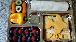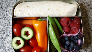 The day after Labor Day, I took this lunch to work in a LunchBots Trio. I had a turkey roll-up, tomatoes carrots, cucumbers, a sweet orange pepper. sugar snap peas, red raspberries, and blueberries. I really like the colors in this box. We have used a slightly modifies version of the turkey roll-up recipe for several years. We like to make these for party food and they are also great for lunches. I usually omit the lettuce called for by the recipe so that I can make a few of these ahead of time to have on hand for lunch packing for a day or two.