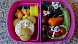 M was the letter for the fourteenth day so I settled on a monkey theme for that day. In the Sistema box, she had a peanut butter sandwich decorated to look like a monkey with candy eyes and mini Vanilla Wafers. She also had Goldfish, sunflower seeds in the yellow container, grapes on picks, blueberries, a small orange pepper, cherry tomatoes, sugar snap peas, and a little Andes mint tucked in the back. I made the monkey picks with stickers.