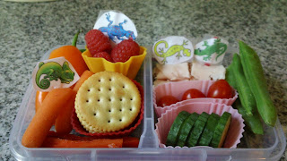 Snack that day was simple, but pretty. She had a cheddar cheese letter L, red raspberries, and letter L Cheez-Its. Luckily, the L crackers were easier to find than the Ks.