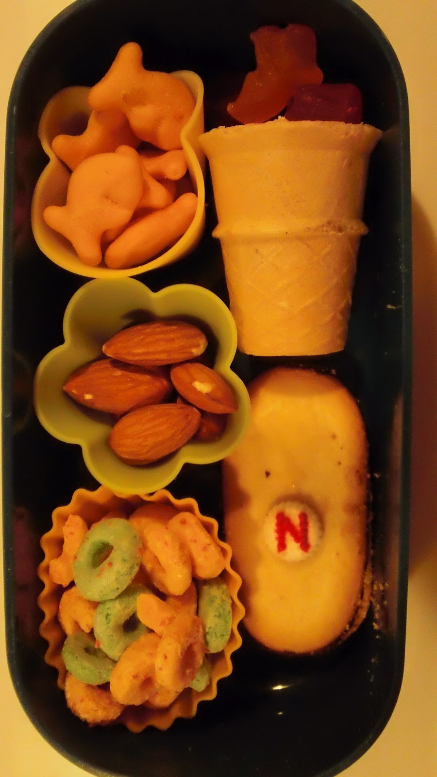 Letter N was the letter of the fifteenth day and I had planned making a lunch focused around nests: baby chicks in nests, pteradactyls in nests, snake eggs in nests, etc., but I unexpectedly had to attend a meeting late into the evening. So, there was no time for making nests.