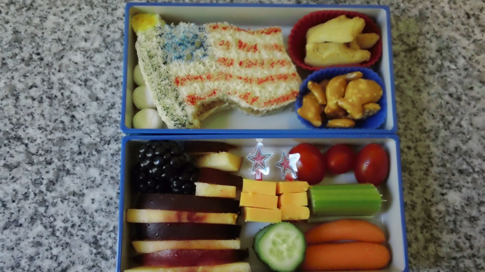 Finally, on Patriot Day, she had a flag-themed lunch. She had a flag-shaped peanut butter sandwich decorated with food safe markers, a few mini animal crackers, a few pretzel Goldfish, and three white butter mints tucked behind the flag. The bottom tier held another flag made of nectarine slices and blackberries. She also had cheddar cheese on homemade star picks, cucumber slices, tomatoes, celery, and carrots. This was packed in our Lego bento box, which I purchased last year from JList. It is a 2×4 block, but Amazon has a similar 2×2 block for sale. Both are stacking bento boxes and are easy for my daughter to open: