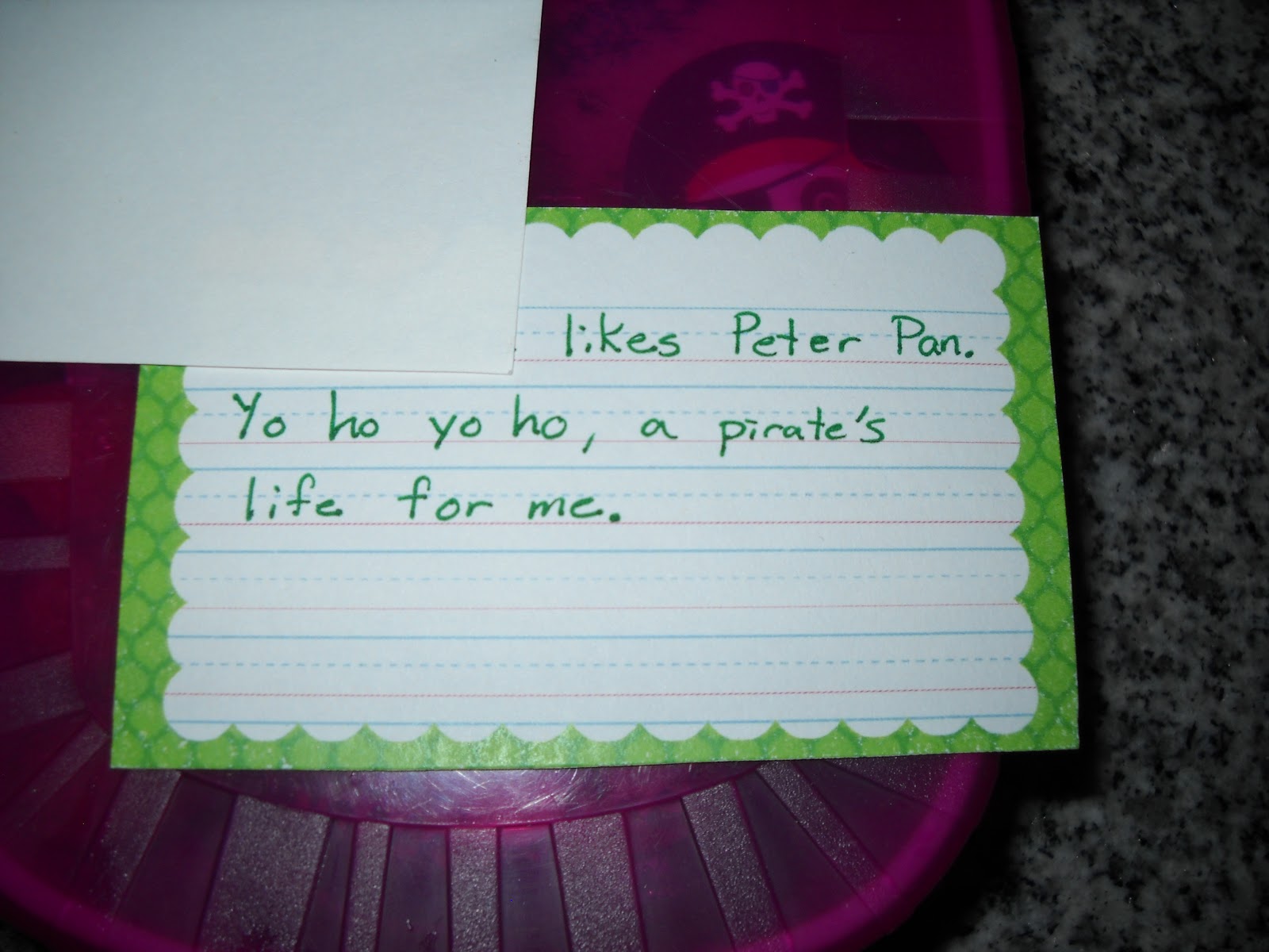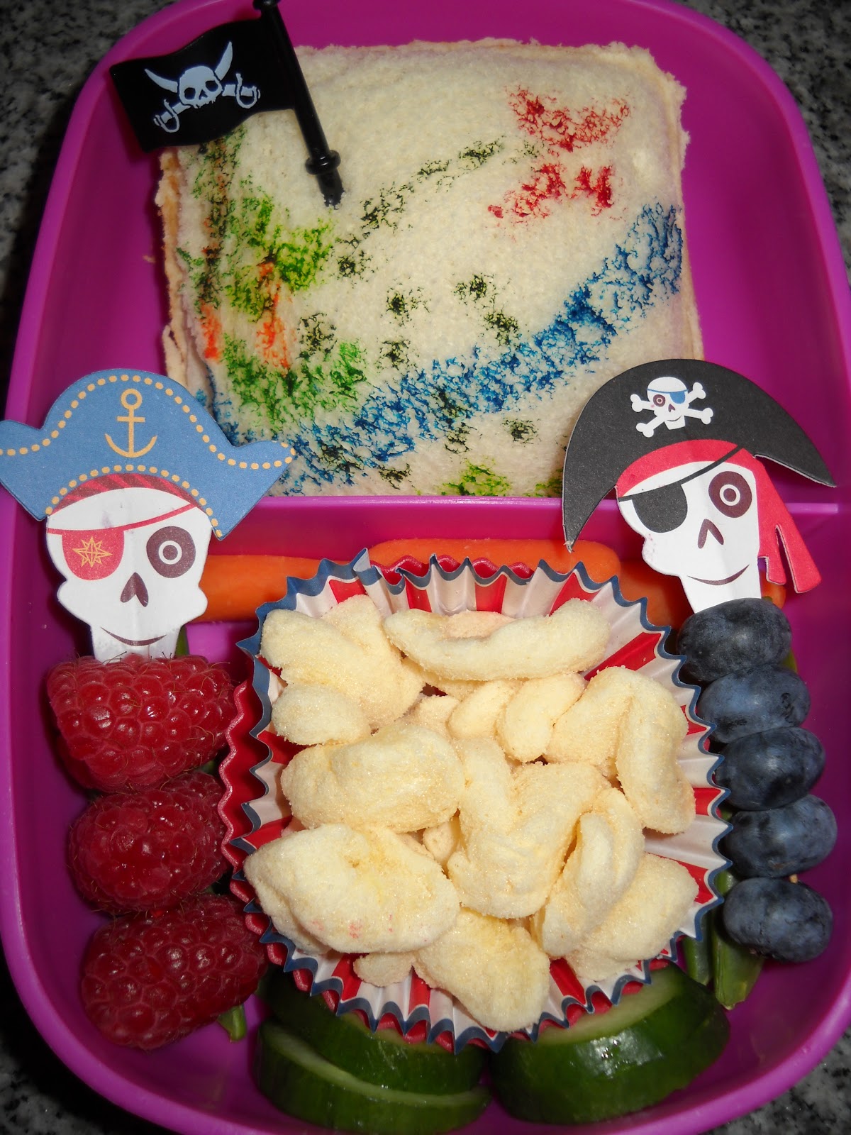 Map-themed lunch. She requested a pirate’s treasure map. I used my sandwich sealer to make the peanut butter sandwich and then used food safe markers to draw on the map. I was attempting to draw a river, pine trees, rocks, a red X to mark the treasure, but drawing on bread doesn’t always turn out the best. I used a flag from a Playmobil set for decoration and I used a couple of picks from a cupcake set to hold blueberries and raspberries. Pirates booty sat on top of a few carrots, sugar snap peas, and cucumber. My daughter saw me packing this lunch; she lifted the sandwich and was disappointed that nothing was under the X on the map. So, after she went to bed, I rummaged through her toys to find a small treasure box. I filled it with jelly beans and placed it under the map to surprise her at lunch the next day. I also included this note to go along with her lunch. When she first started kindergarten, I was concerned about what kind of note to include for someone who was just learning to read. I couldn’t find any preschool or pre-reader lunch notes to buy. But, her school has really pushed “high-frequency” words (such as: I, like, we, the, a, and, me, look) so I have included lots of notes using these words. My daughter requested that I also include a note on this day with the quote, “Yo ho yo ho, a pirate’s life for me.” that she remembers from the Peter Pan play we saw earlier this fall. She couldn’t read it independently, but I included it anyway.