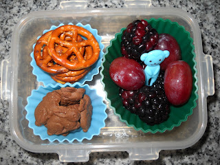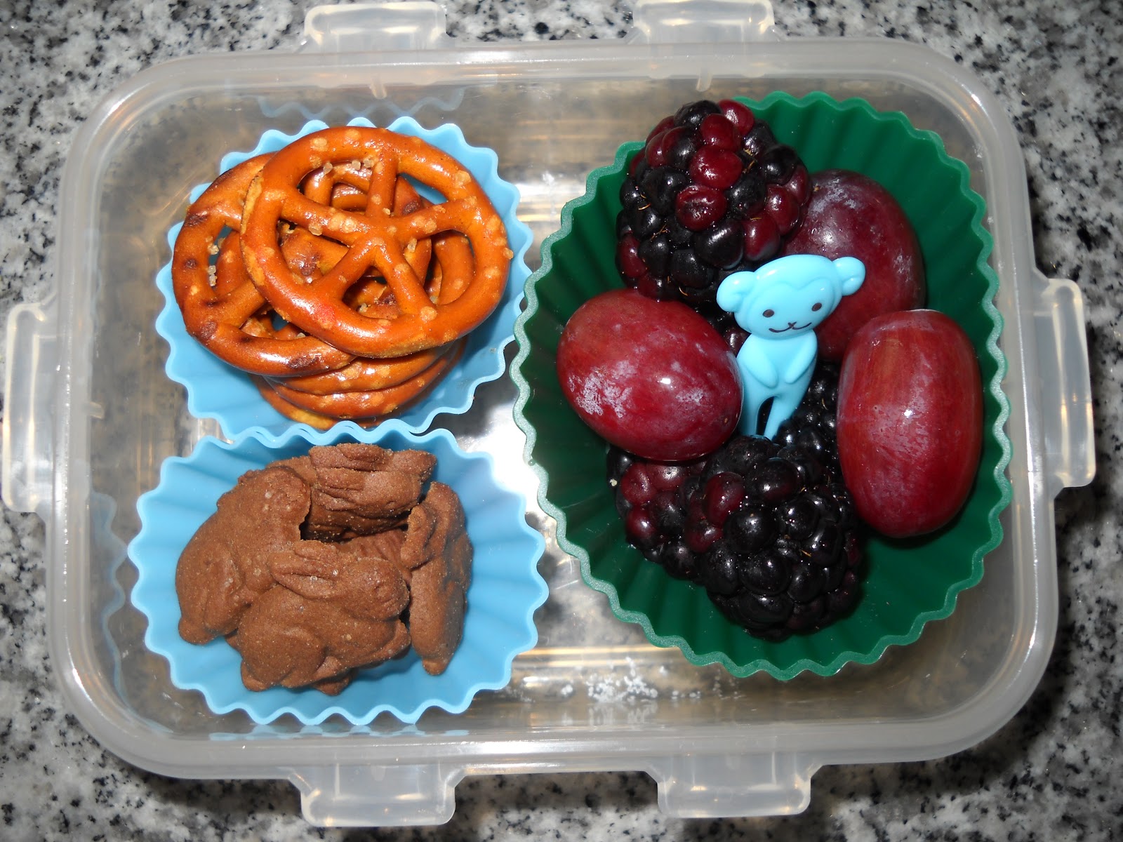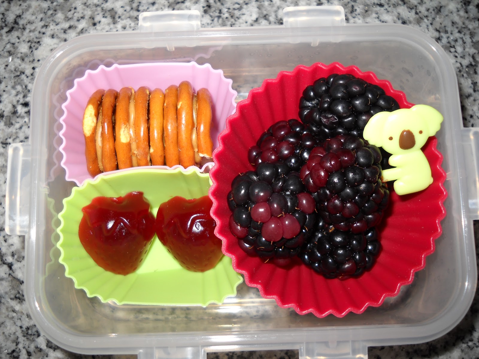 Snack that day included blackberries with a koala pick, a few peanut butter pretzels, and two homemade strawberry-shaped gummies.