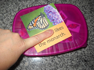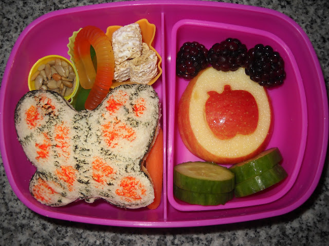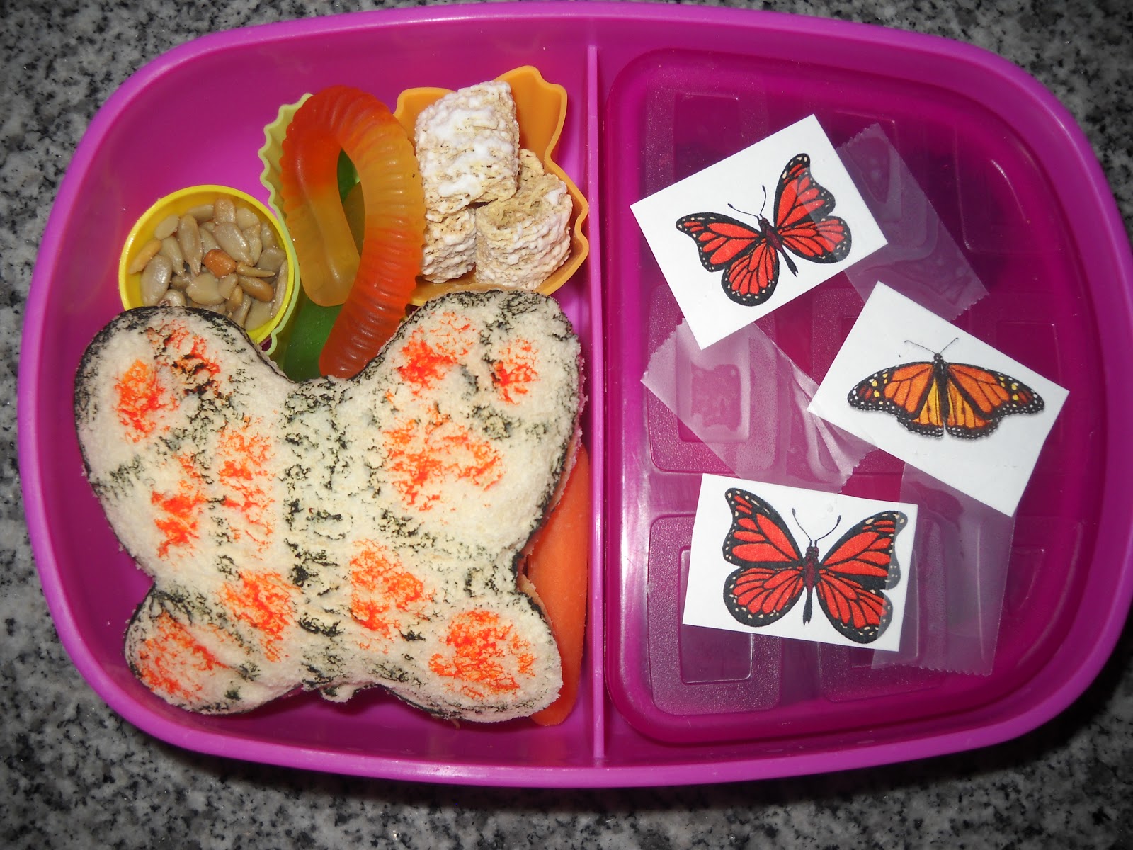 I chose a monarch theme for Friday’s lunch because it began with the letter M and because they were learning about the life cycle of a butterfly. In the left hand side of the box, I mimicked the life cycle stages: the sunflower seeds were the eggs, the gummy worm was the caterpillar the pieces of Mini Wheats were the chrysalis, and the peanut butter sandwich was the butterfly. The other side of the box held slices of apple, blackberries, and cucumber slices.