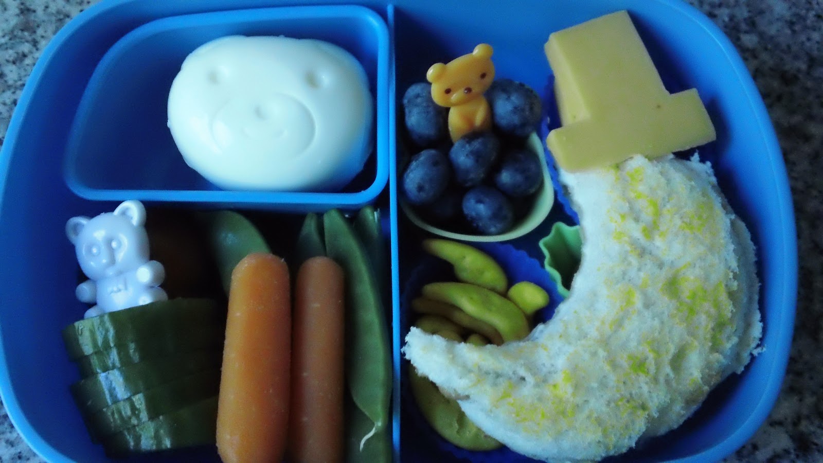 After spending one day per letter of the alphabet, my daughter’s kindergarten class began focusing on one letter a week. They started with the letter M and we planned letter M themed lunches for the week. (These lunches are from September, I am WAY, WAY behind on posing!) Monday’s lunch was inspired by the book Happy Birthday Moon. It is a story about a bear who gives the moon a hat for a birthday present. The bear places the hat high in a tree so that the moon can “wear” the hat. Later, the wind helps the moon return the hat to the bear and the bear thinks that the moon has given him a gift. So, for this lunch, my daughter had a Moon-shaped peanut butter sandwich wearing a cheddar cheese hat. She also had come blueberries in a bear shaped silicone cup with an orange bear pick, a few moon shaped crackers, a bear shaped egg, cucumber slices on a bear pick, carrots, and some sugar snap peas.