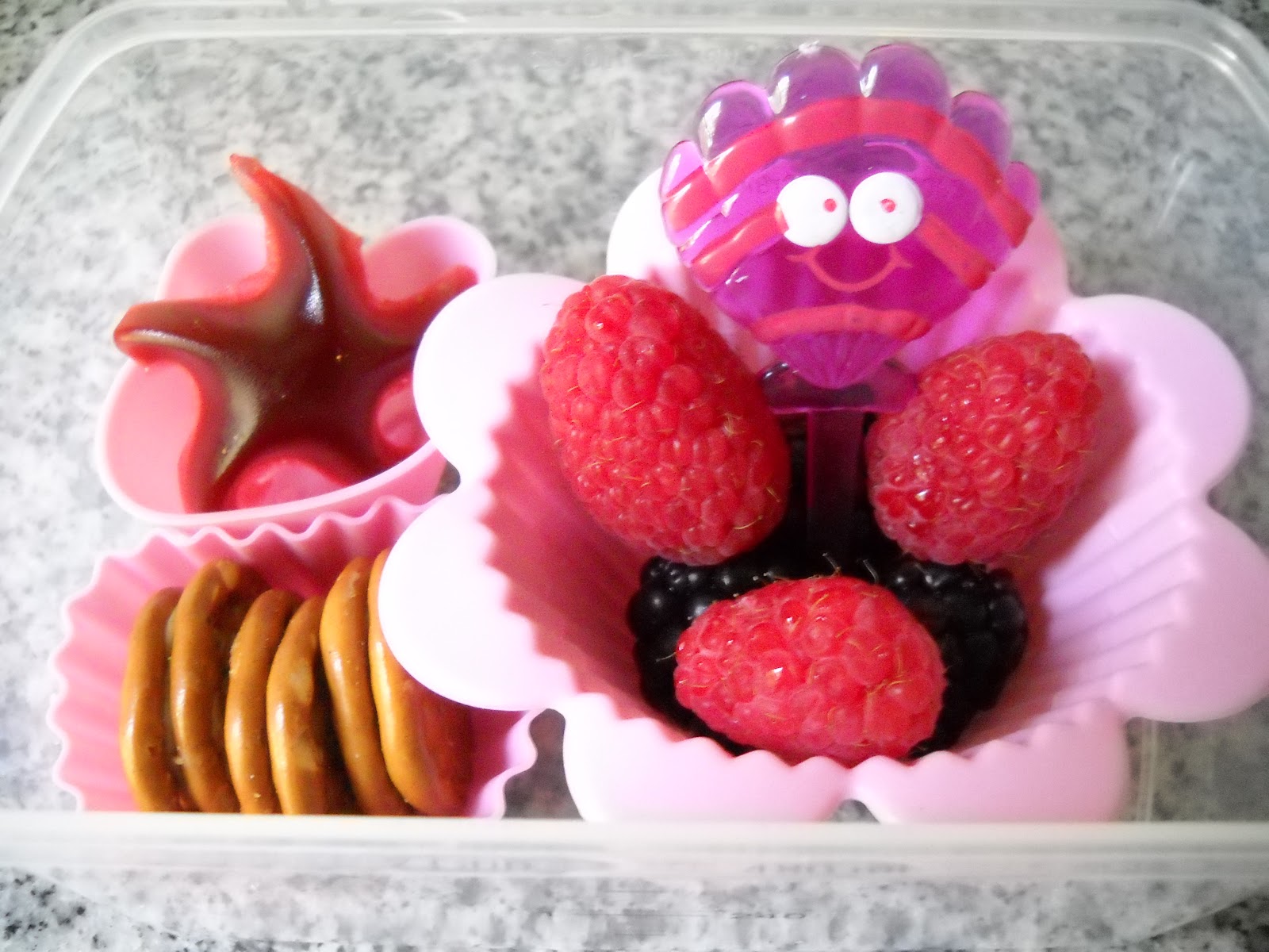 The snack for Thursday included a homemade raspberry gummy star, peanut butter pretzel sandwiches, raspberries and blackberries with a shell pick.