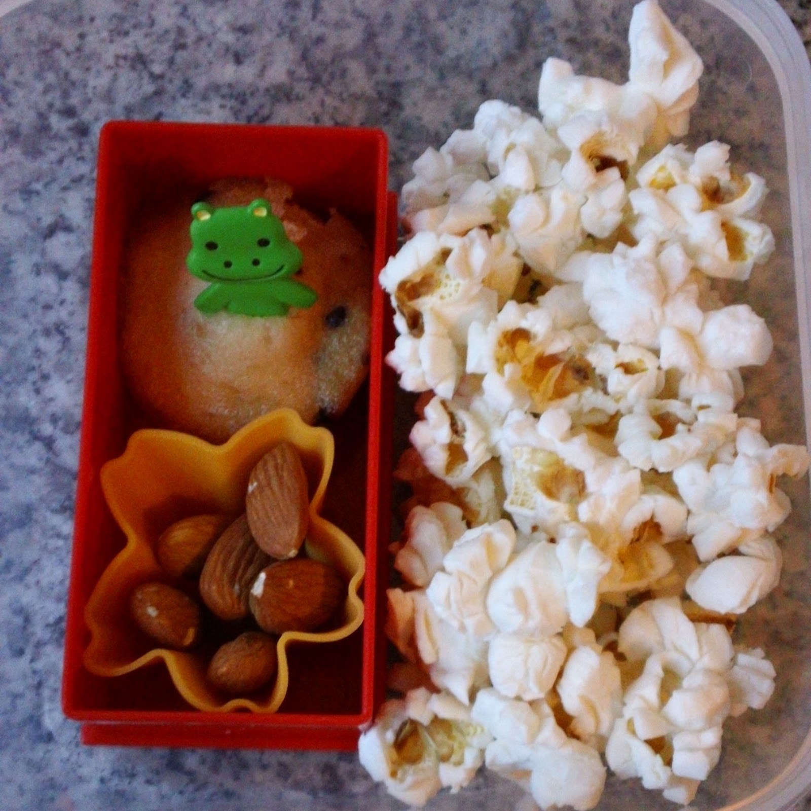 Snack that day was simple. It held popcorn, almonds, and a mini chocolate chip muffin.