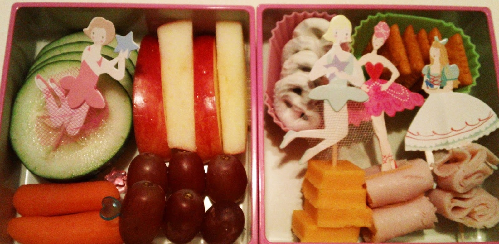 For the last lunch of the week, I used the new pink Lego box again. My daughter had cucumber slices, carrots, apple slices, grapes, yogurt covered pretzels, Cheez-Its, cheddar cheese cubes, and turkey slices. I had a couple of ballerina picks from a cupcake set and made a couple more by cutting the wings off of two from a fairy set.