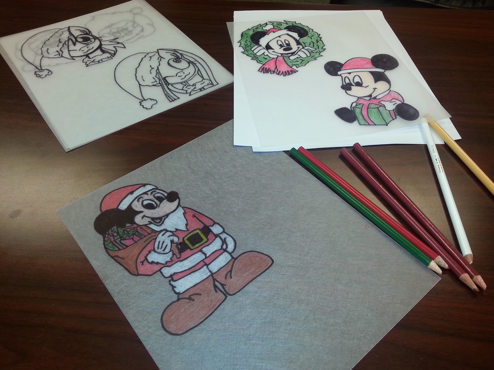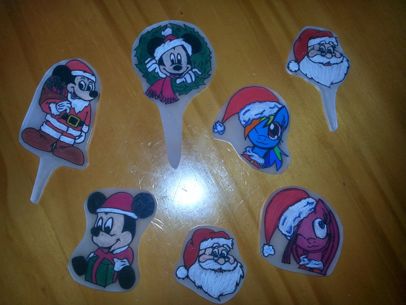 I had some sheets of plain Shrinky Dink material so I chose some images to trace and color. I used a black Sharpie to trace the image on the Shrinky Dink sheet and then I colored the images with colored pencils. I chose images of Mickey Mouse for my son’s bento because he has loved watching Mickey’s Christmas Carol during the last weeks and he is becoming a Mickey Mouse Clubhouse fan. For my daughter, I chose My Little Pony images because she often requests that as a theme for lunches. All of the figures are wearing Santa hats and I did a couple of traditional Santa Claus faces also.