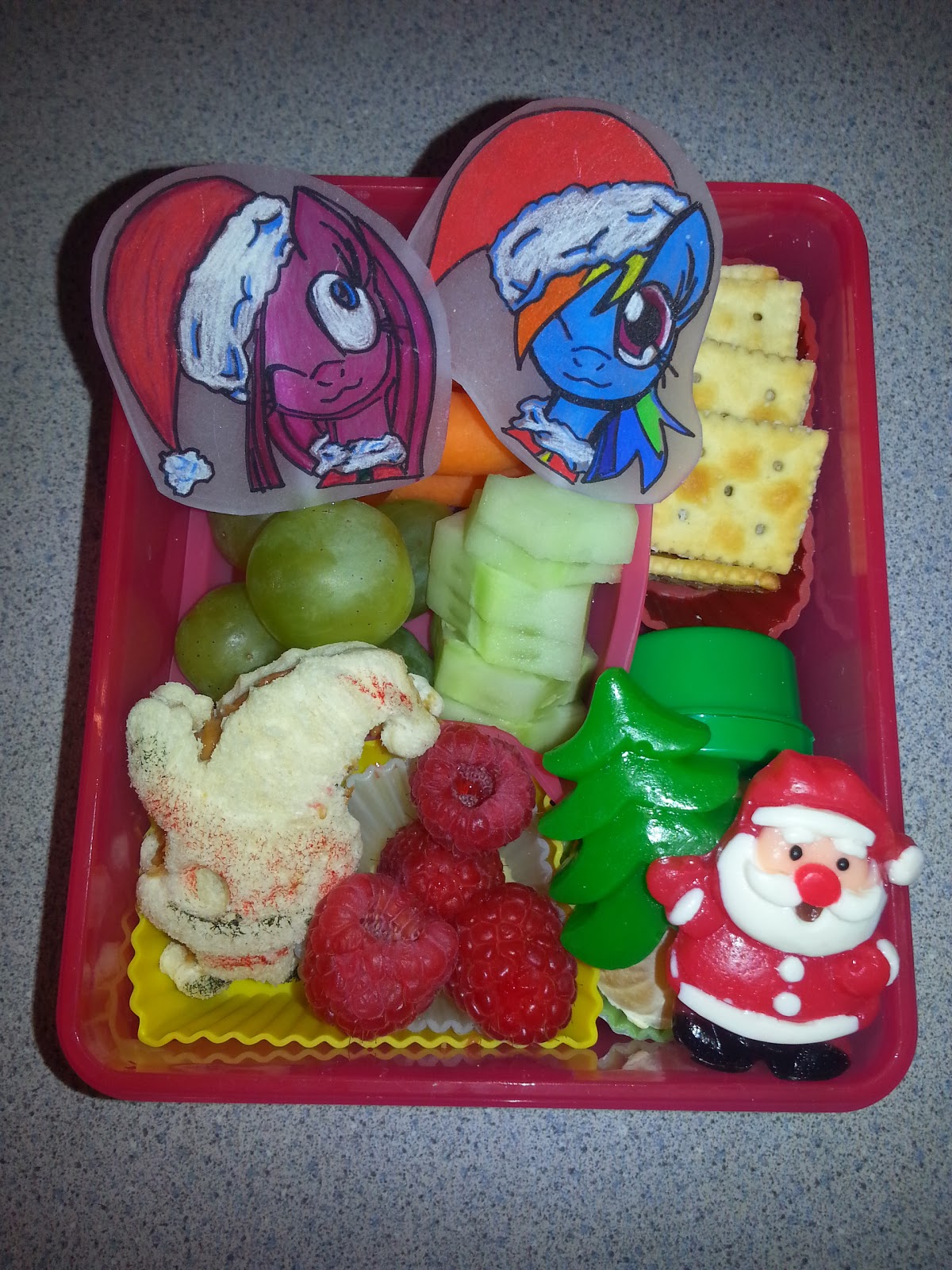 For lunch, my daughter had a mini Santa-shaped peanut butter sandwich, raspberries, grapes and cucumber slices on picks, carrots and cherry tomatoes (behind the picks), mini saltines, almonds in the little green container, and half of a Cutie tucked under the Santa and Christmas tree gummies (from Target).