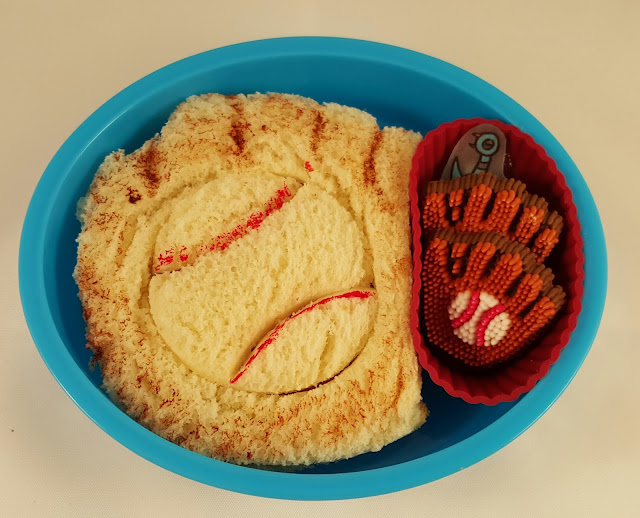 In the other tier of the box, I featured catcher’s mitts since the story is about playing catch. I used my Sports Lunch Punch (currently on sale on Amazon for $4.99 – a great deal!) to make a peanut butter sandwich shaped like a catcher’s mitt with a baseball inside. I used food safe markers to accent the features. I also included two catcher’s mitt icing candies on the side. I was lucky to have these on hand! My husband bought them for me a while ago and remembered they were in the cabinet when I was packing this. They were perfect. Behind the candies, you can see my pigeon pick peeking out; check out the first post in my series to read about him.