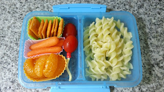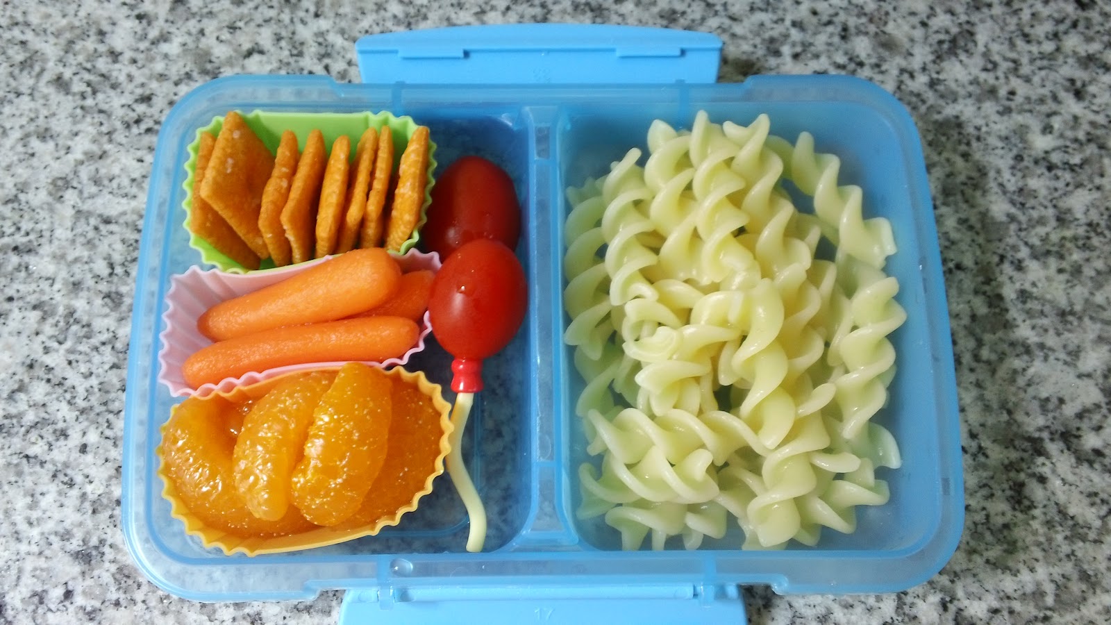 This was a quick pre-party snack for my daughter. She was headed to a pool and pizza party, but since she doesn’t really eat pizza (only pepperoni), I wanted her to have a small lunch before leaving home. In the Sistema box, she had a few Cheez-Its, two tomatoes on balloon picks, a few carrots, mandarin oranges, and some plain rotini noodles. I had to refill this box a few times because she kept eating out of it before I could take a picture :).