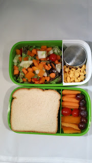 This lunch was for my husband packed in a new MyBentoLunch box picked up at TJMaxx. He had a salad, with ranch in the metal KidsKonserve container, and a few goldfish in the bottom tier. The top tier held a turkey sandwich, carrots, tomatoes, orange pepper slices, and a few grapes.