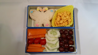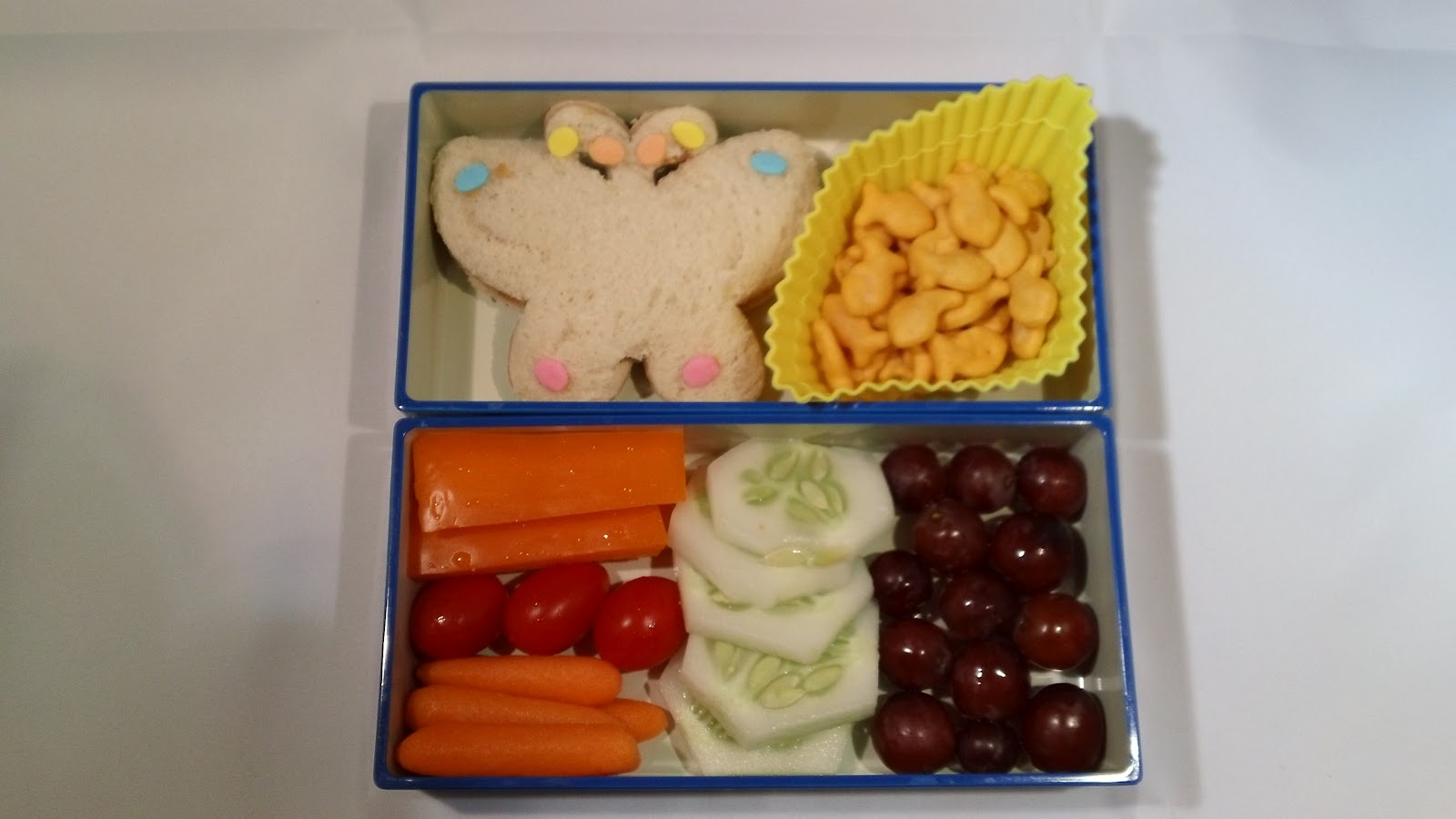 This lunch was for my daughter. I packed a peanut butter sandwich in the shape of a butterfly that was decorated with sprinkles. She also had goldfish, orange pepper slices, cherry tomatoes, carrots, cucumber slices, and purple grapes. This will be a practice lunch for my daughter. She is going to work with me for the day and will try out her new lunch bag and water bottle. I will have a chance to watch and make sure she knows how to open everything on her own.