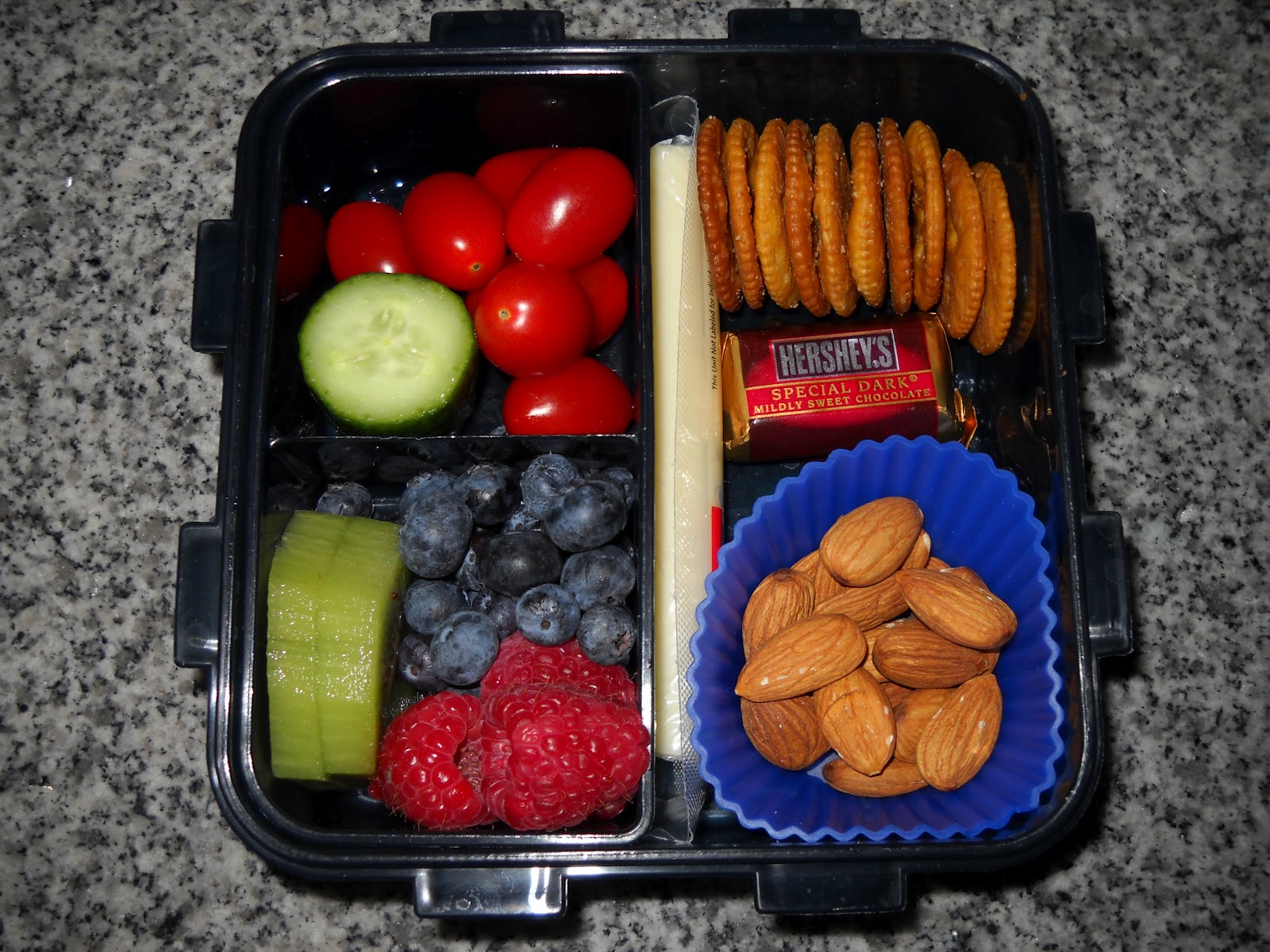 My husband had cucumber and tomatoes in the first section and kiwi, raspberries, and blueberries in the second section. The large section held a turkey sandwich, pretzel crackers, and a couple of mini chocolate bars.