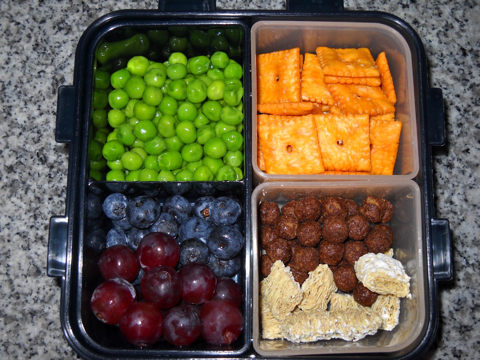 This was a snack my children shared while we were waiting for a play to start. They had some peas, Cheez-Its, blueberries, purple grapes, Cocoa Puffs, and “Little” Frosted Mini Wheats.