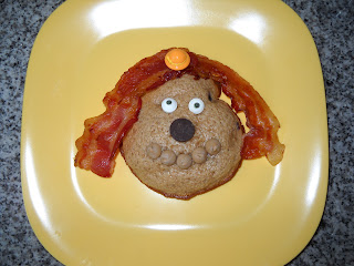 This was a breakfast muffin/person/monster/character for my daughter. We couldn’t decide exactly what it reminded us of. We thought it was a little like the Goon from Goodnight Goon, a little like a monster from Where the Wild Things Are, and a little like a Wallace and Gromit character. At any rate, she had a blueberry muffin made in our muffin top pan with fresh blueberries. It was decorated with bacon hair secured with a little bonnet pick, candy eyes, a dark chocolate nose, and cappuccino chip teeth.