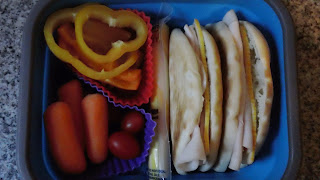 I had a similar sandwich with a string cheese, carrots, tomatoes, and tri-color pepper rings.
