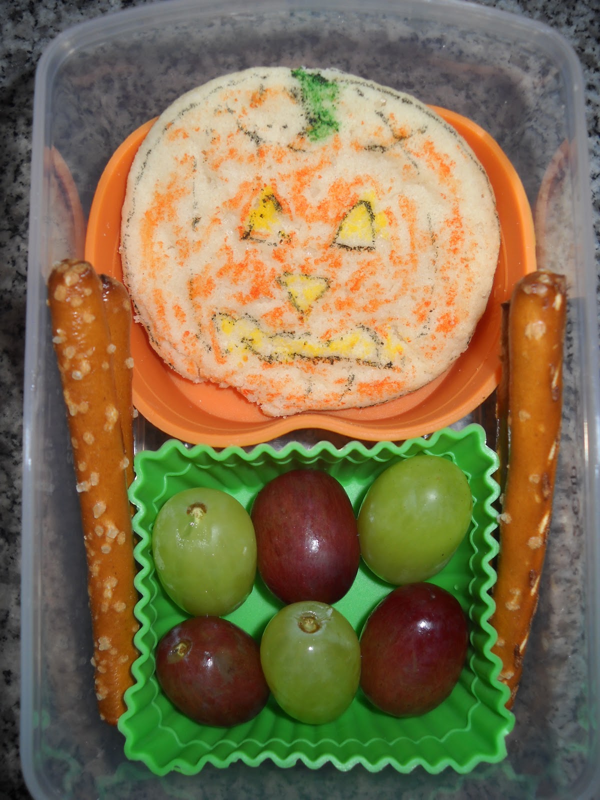 On two other days, I decorated sugar cookies that were leftover from a baby shower that we hosted. I drew a web on one with a food safe marker and added a spider from a Martha Stewart die-cut set. Along with the cookie, she had green and purple grapes on spider picks, and a few Spiderman Cheez-Its in a spider cupcake liner. I used markers to decorate the other cookie like a Jack-o-Lantern. She had grapes and pretzel rods along with it. Both of the cookies were very fast to make and I was pleased with the way these snacks came together with minimal time invested.