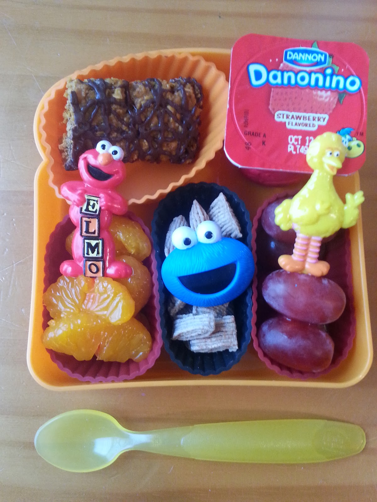 My son is 2.5 and doesn’t really understand Halloween yet so for his breakfast for daycare I stuck with something he does like: Sesame Street. In his Elmo “picnic box” as he calls it, I packed half of an Odwalla Chocolate Kick Kids bar, a mini cup of yogurt, mandarin oranges on an Elmo pick, oatmeal squares with a Cookie Monster ring, and grapes with a Big Bird pick.