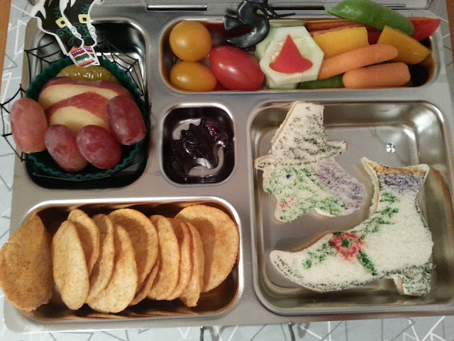 My lunch was packed in a Planetbox. Grapes, plum slices, and mandarin oranges are in a silicone cup wrapped in a paper web with witch’s boots poking out the top. Tomatoes on a witch pick, cucumbers, carrots, peas, and peppers fill the long top section. Peanut butter sandwiches shaped like a witch head and boot are included alongside chipotle lime cracker chips, with a grape bat gummy in the center section.
