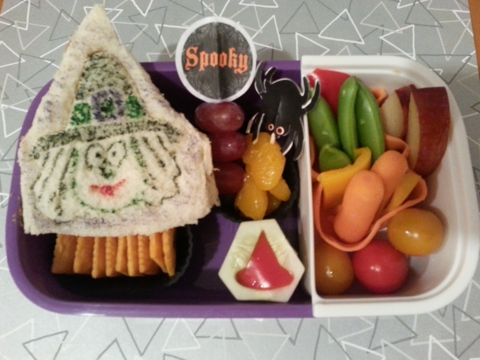 I decided on witch-themed lunches for this post. First, I will share my daughter’s. I used a cookie stamp to press a witch face onto her peanut butter sandwich and then I decorated it with food safe markers. Grapes and mandarin oranges are beside the sandwich on paper picks saved from last year. Below the fruit is a stack of cucumber slices. I used a Linzer cutter to cut a witch’s hat out of red pepper and stuck it inside the top slice. The right side of the box holds sugar snap peas, carrots, tomatoes, pepper pieces, and slices of plum.