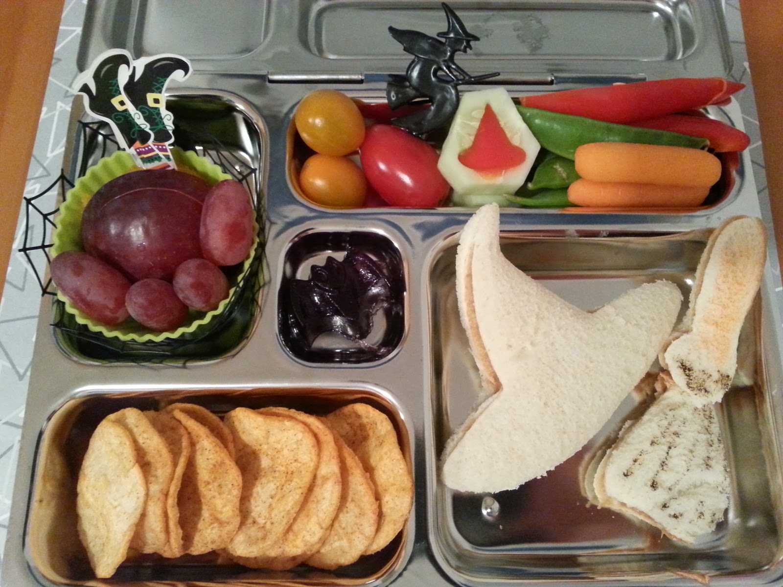 My lunch was packed in a Planetbox. Grapes, plum slices, and mandarin oranges are in a silicone cup wrapped in a paper web with witch’s boots poking out the top. Tomatoes on a witch pick, cucumbers, carrots, peas, and peppers fill the long top section. Peanut butter sandwiches shaped like a witch head and boot are included alongside chipotle lime cracker chips, with a grape bat gummy in the center section.