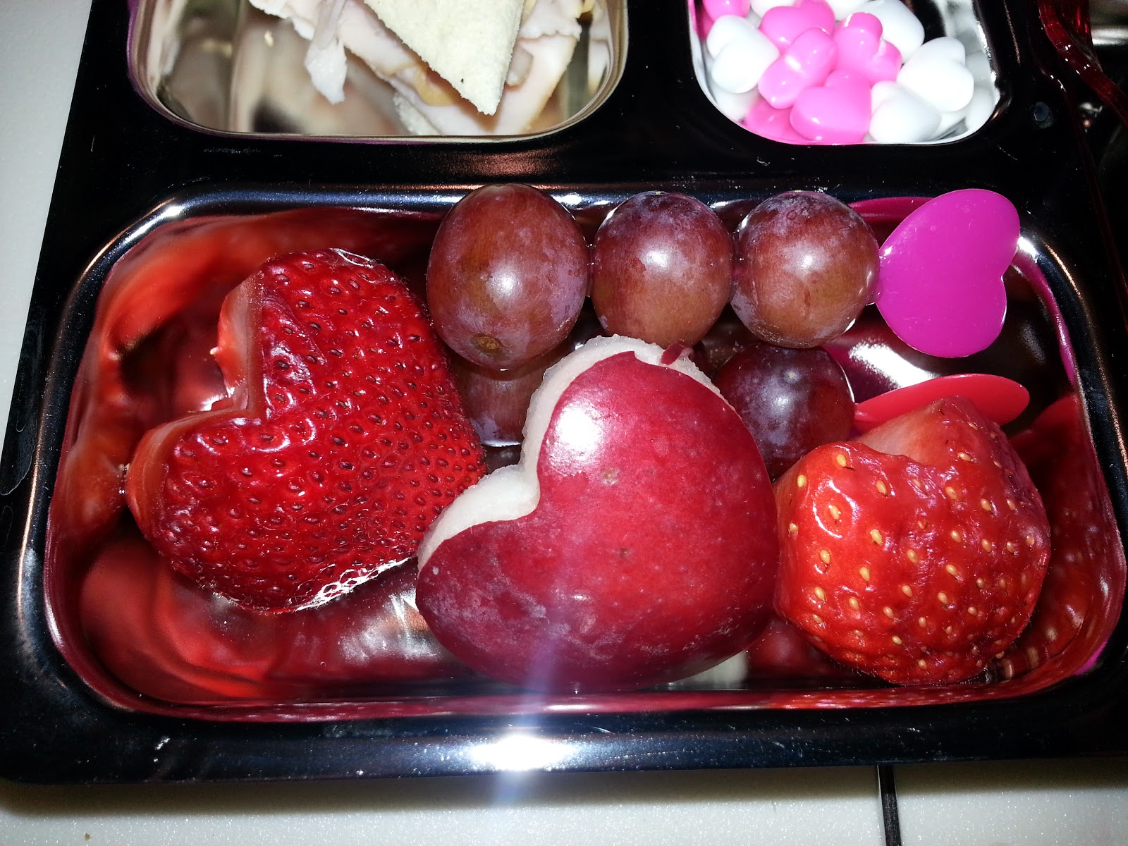 He had heart-shaped strawberries, a hear-shaped piece of apple, and grapes on a pink heart pick.